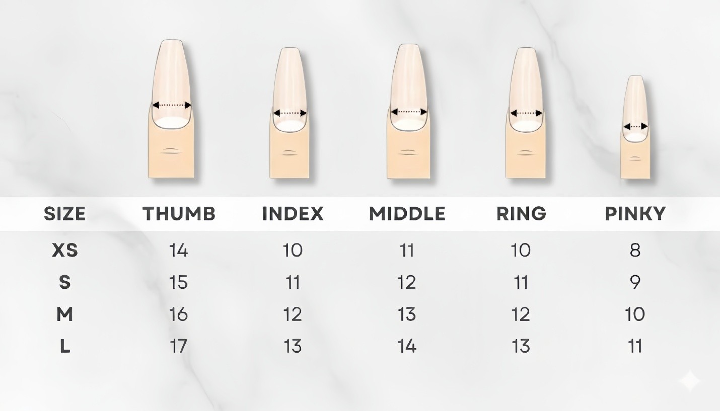 Find the perfect fit for your press-on nails. Follow the simple instructions below for accurate measurement and to select the right size.