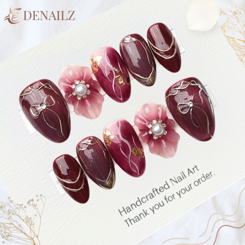 is a set of handcrafted press-on nails that exude a bold, romantic, and luxurious aura with a combination of deep wine red colors and artistic 3D floral details. It blends a solid glossy Wine Red gel polish with beautifully subtle transparent pink marbling. Nails with a wine red base are adorned with delicate metallic gold ribbon or wavy line patterns, adding a touch of luxury. The marbled nails serve as the main statement with 3D flower accents molded from soft pink acrylic/gel with a pearl center, creating a captivating dimension. These press-on nails are perfect for formal events, evening parties, or for anyone looking to make a stunning impression with classy and artistic nail designs.
