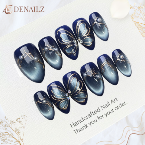is a set of handcrafted press-on nails that capture the mysterious and elegant charm of the night with a rich dark blue (midnight blue) color palette. Featuring the signature magnetic Cat Eye effect, it creates a shifting light gradient that adds gemstone-like depth. On some nails, there are butterfly motifs delicately drawn with graceful metallic gold lines, as if the butterflies are fluttering under the moonlight. Small pearl beads or rhinestones are strategically placed to add a touch of luxurious glamour. These press-on nails are perfect for special occasions, evening parties, or for those who want to express a classy, elegant, and slightly mysterious style.