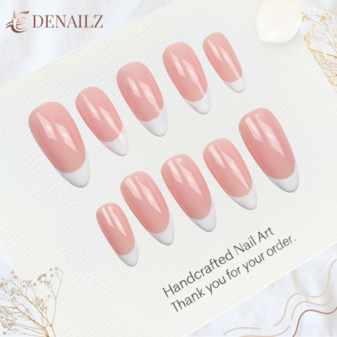 is a set of handcrafted press-on nails that exude a clean, elegant, and timeless aura, focusing on the perfection of the classic French Manicure look. This design is highly unique due to its simplicity and elegance, featuring a blend of soft, semi-transparent Pink Nude base (natural nail color) paired with a crisp, neat ivory white tip (French tip). The curved line (smile line) of the French tip is drawn with high precision, creating a well-groomed, professional, and highly aesthetic nail appearance. These press-on nails are perfect for everyday wear, professional settings, formal events, weddings, or for those who love a minimalist, clean, and classic nail style.