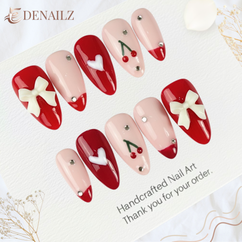 The "Cherry Love Korean" collection by EDENAILZ is a handcrafted set of press-on nails that exudes a sweet and girly charm, featuring a blend of bright, glossy cherry red and soft baby pink. The design is incredibly cute, showcasing adorable 3D raised white ribbon details, cherry fruit paintings, and sweet heart shapes, all enhanced with crystal accents. These press-on nails offer a quick way to achieve a cheerful and stylish Korean-inspired nail look.