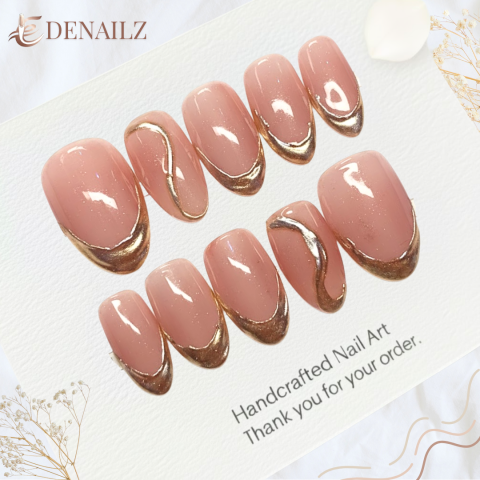 is a set of handcrafted press-on nails that exude a minimalist, luxurious, and classy aura with a blend of soft nude shades and shimmer. Using a semi-transparent Pink Nude gel polish (jelly nude) as the base color, it gives the nails a healthy, glossy, and natural appearance. Each nail is adorned with metallic Rose Gold accents applied to the tips, forming a modern and bold "V-cut French Tip" that frames the nails. This accent provides a luxurious mirror-like shine that stands out. On some nails, the design is enhanced with thin swirling metallic gold lines, adding an elegant artistic touch and reinforcing the premium feel. These press-on nails are perfect for daily wear when you want to look luxurious, office events, or if you love minimalist chic nail styles with a glamorous touch.